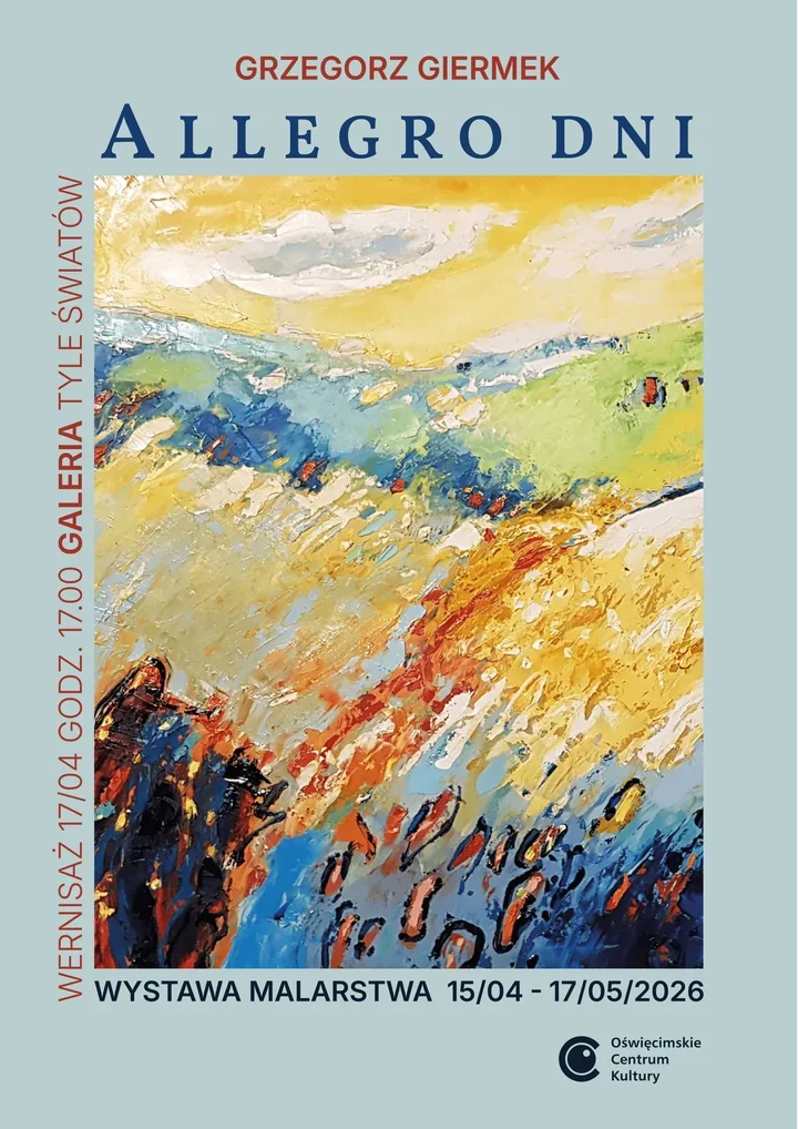 W galerii „Tyle światów” Oświęcimskiego Centrum Kultury wiosna dostanie swój malarski akcent. Od 15 kwietnia do 17 maja 2026 roku będzie można oglądać wystawę Grzegorza Giermka „Allegro dni”, a spotkanie z artystą podczas wernisażu zaplanowano na 17 kwietnia o godzinie 17:00. 🎨